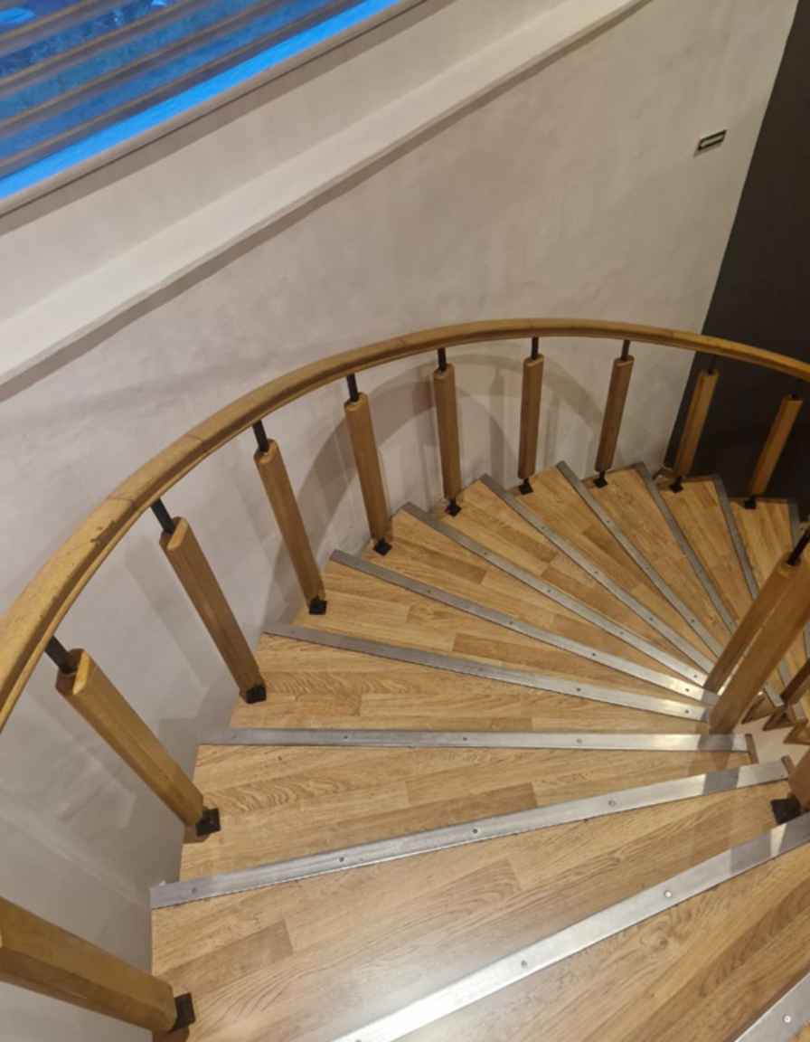 Unique curved staircase structure with wooden tread and wooden balustrades